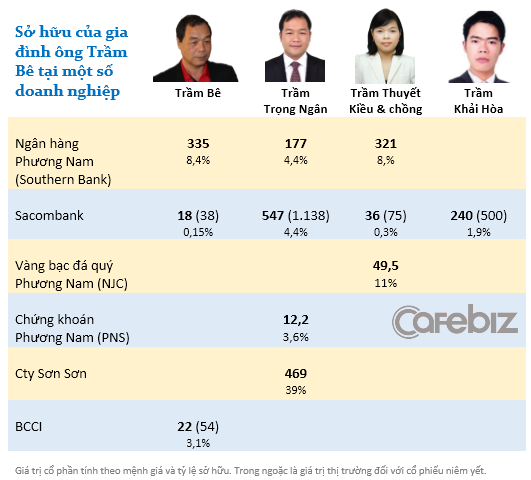 Trả lời báo chí về việc vì sao Ngân hàng Phương Nam đề nghị được sáp nhập vào Sacombank, Chủ tịch Sacombank Phạm Hữu Phú đã nhận định: hai ngân hàng mang dáng dấp một chủ sở hữu. Ông Bê có ảnh hưởng rất lớn tại cả hai ngân hàng trên. Tại Sacombank, ông Bê cùng 3 người con của mình đang trực tiếp sở hữu 81,2 triệu cổ phiếu, tương đương 6,8% lượng cổ phiếu đang lưu hành; với giá trị thị trường lên đến gần 1.800 tỷ đồng. Còn tại Ngân hàng Phương Nam, ông Bê và gia đình đang nắm giữ hơn 83 triệu cổ phiếu, tương đương 20,8% cổ phần. Con trai cả Trầm Trọng Ngân thay ông Bê giữ chức vụ Phó chủ tịch thường trực và con gái Trầm Thuyết Kiều giữ vị trí Phó tổng giám đốc.