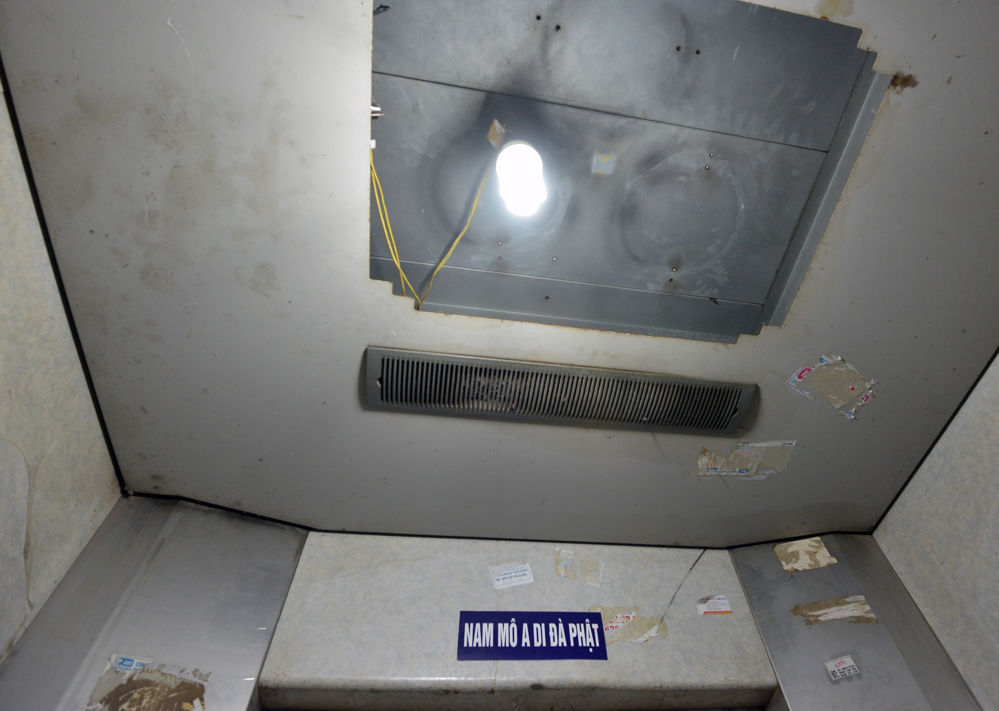 Phần nắp kỹ thuật đã bị tháo tung do nhiều lần sửa chữa. Cư dân phải gắn tấm biển nhỏ đề dòng chữ "A di đà phật" để cầu may và trấn an tinh thần mỗi khi vào thang máy.