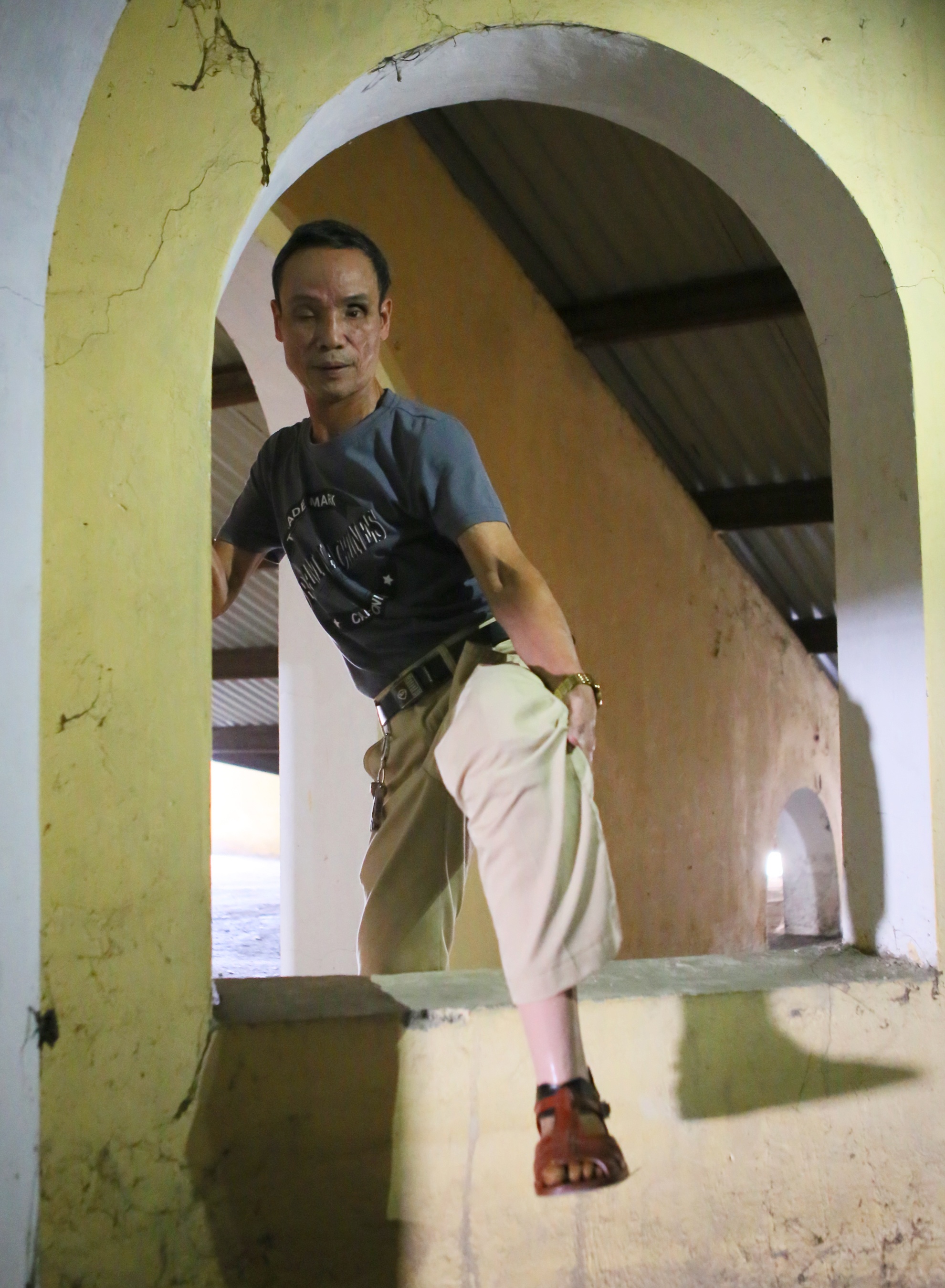 Ông Chu Văn Huấn (thương binh 1/4 sống tại tầng 11) phải tự nâng chiếc chân giả của mình đi vòng qua tầng mái để tìm chỗ chui thuận tiện nhất. Ông cho biết, mình là nạn nhân trong sự cố thang máy rơi tự do cách đây không lâu tại đây.