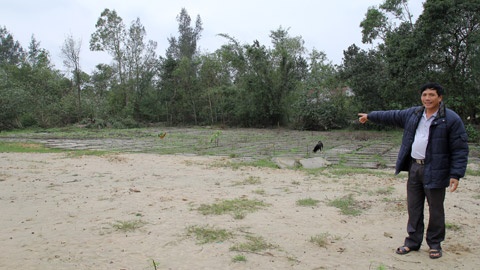 | Bí thư thôn Song Yên đứng bên mảnh vườn đã được công ty đổ đất để triển khai khu tái định cư. Thế nhưng 1 năm qua không làm tiếp, mưa bão đến gây cảnh ngập úng. |
