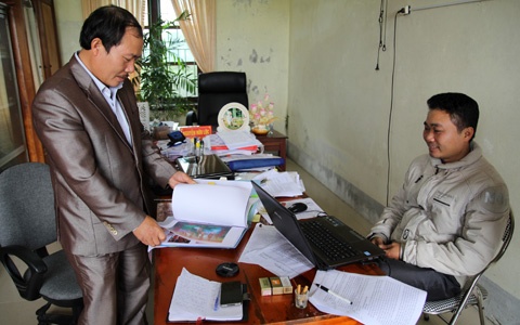 | Lãnh đạo xã đang xem lại cuốn ca-ta-lo “Lễ khởi công” hoành tráng diễn ra vào ngày 24/7, nhưng rồi đã không diễn ra. |