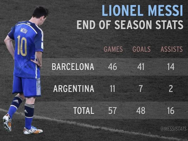 Nhưng chưa bao giờ, anh than vãn vì sự bất công đó, mà trái lại luôn tìm cách để đáp đền quê hương. Vì nghĩa tình ấy, anh chấp nhận buông sức cuối mùa giải và lần thứ hai trong sự nghiệp trắng tay cùng Barca. Với Messi năm 2014 chỉ có World Cup, anh đến Brazil với khát khao cháy bỏng. Khát vọng chiến thắng, khát vọng lấy lại tình yêu của dân tộc.