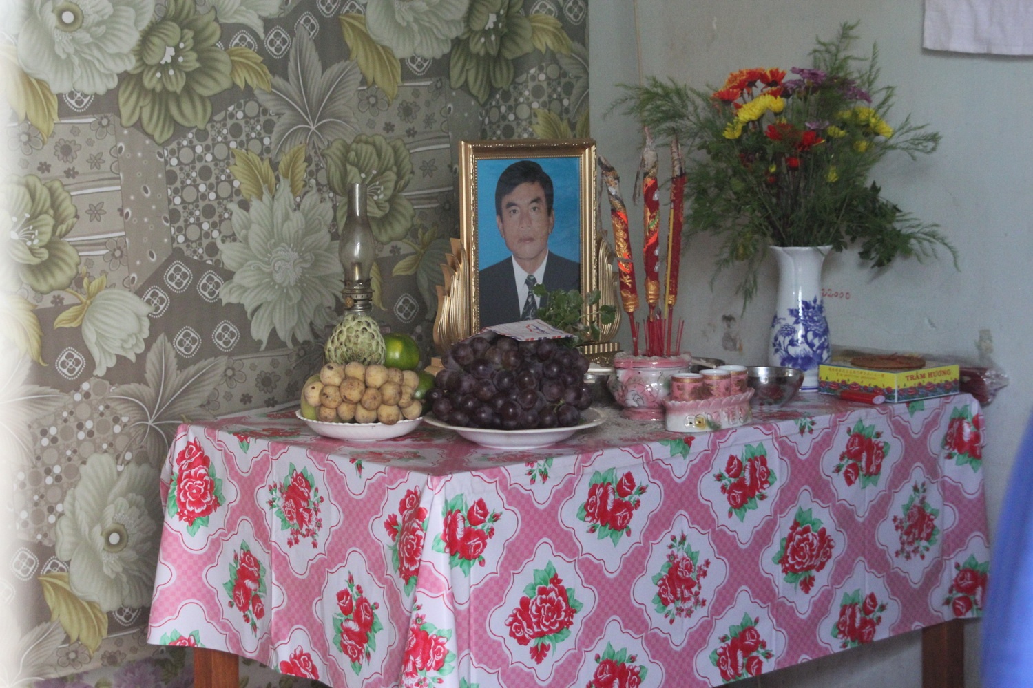 Cùng xóm với bà Thương, chị Nguyễn Thị Mỹ đã chuẩn bị bàn thờ, di ảnh của chồng là anh Nguyễn Văn Hiệp. Chị thẫn thờ cho biết: “Từ 16/9 khi nghe tin tôi đã chuẩn bị bàn thờ và di ảnh để hương khói cho linh hồn anh ấy đang ở dưới biển lạnh lẽo được ấm cúng".| Chị Nguyễn Thị Mỹ đã chuẩn bị bàn thờ, di ảnh của chồng. |