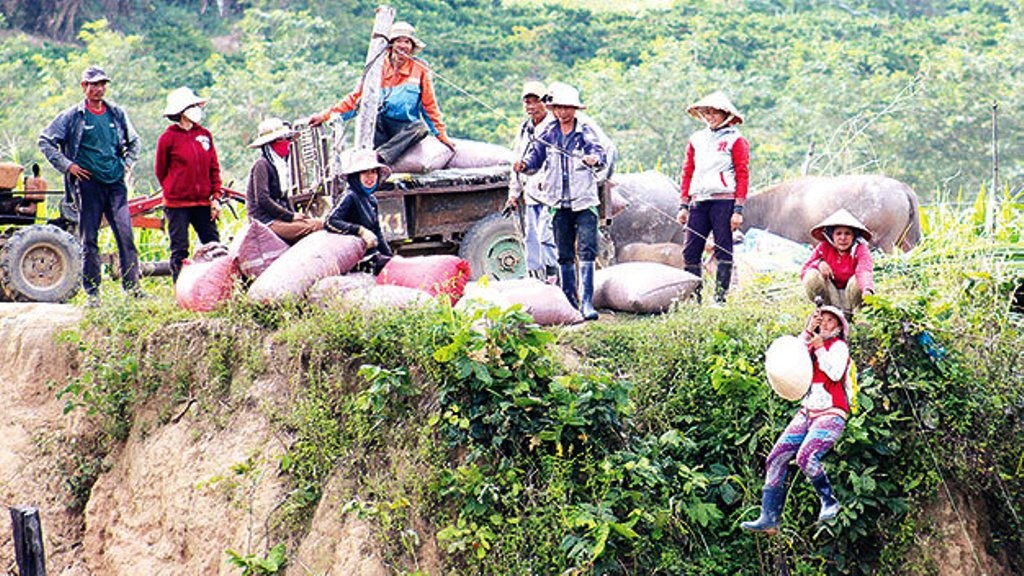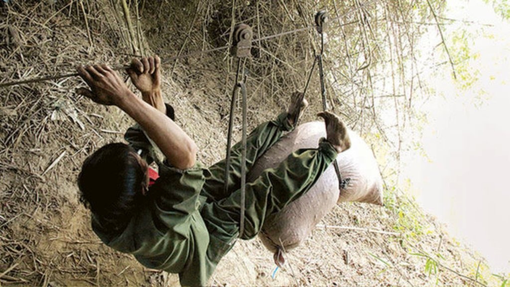 | Bao cà phê đang qua sông thì bị mắc kẹt giữa dòng. Một người đàn ông từ trong bờ đu ra kéo vào. |