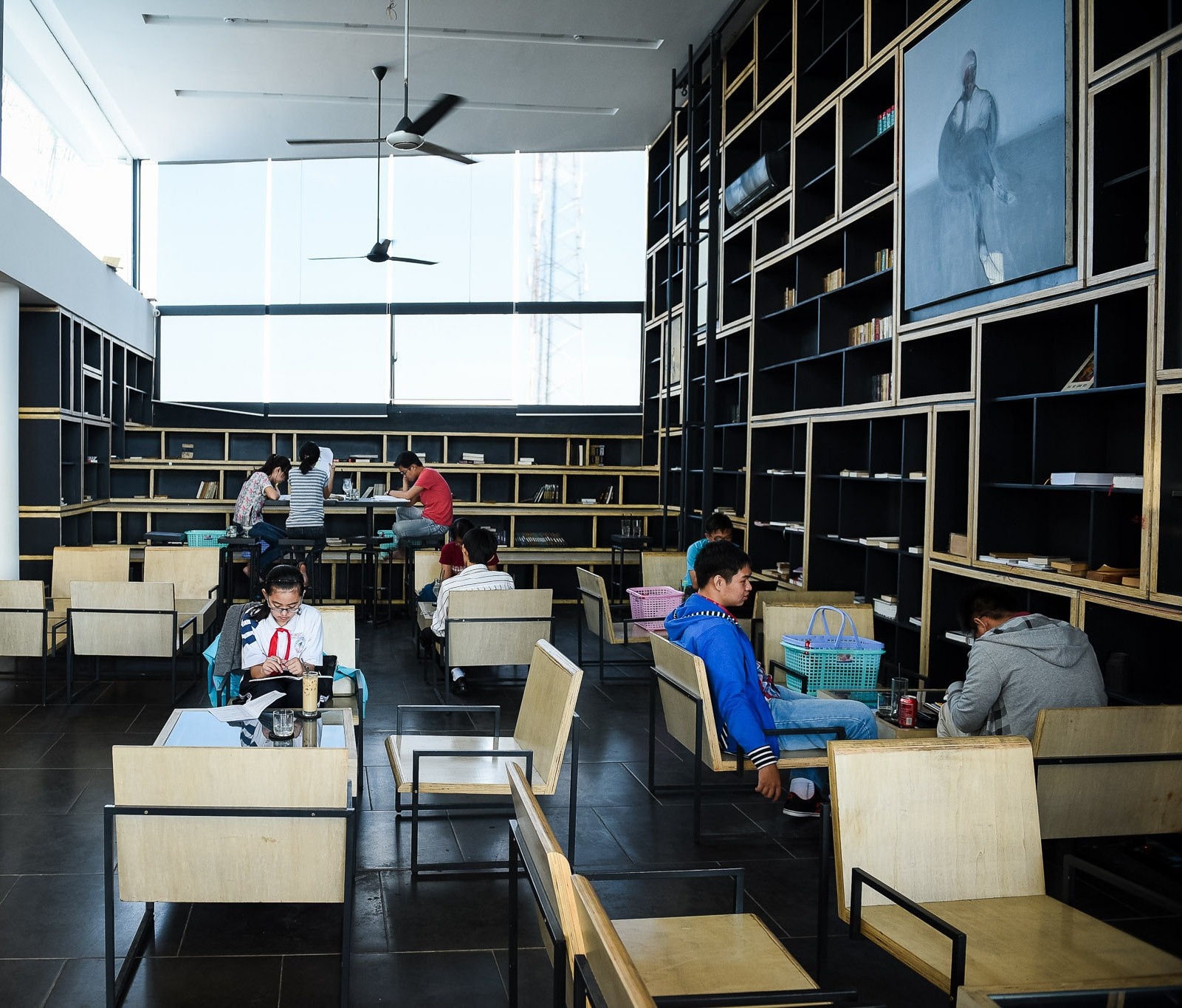 | Tầng trên cùng của Cá chép là không gian cà phê. Với thiết kế mở, sử dụng kính phía trước và sau tạo cảm giác thoáng mát, thư giãn cho người đọc. Toàn bộ không gian này bao phủ bởi tông màu trầm để phù hợp với những cuốn sách cũ và quý hiếm được trưng bày trên kệ hoặc ngay tại bàn đọc. |