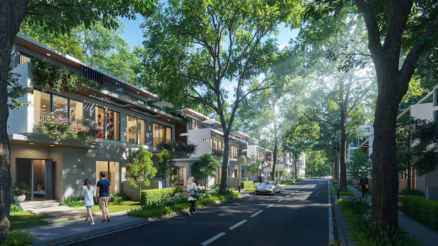 Mặt trước mỗi căn biệt thự Forest Villas được xây dựng lùi sâu vào 5 m, tạo không gian cho gia chủ cũng như khách đỗ xe. Mỗi ngôi nhà nép mình dưới hàng cây xanh, đảm bảo không gian sống riêng tư, hạn chế ảnh hưởng bởi tiếng ồn và khói bụi xe cộ. Mặt sau mỗi căn nhà cũng được bố trí lùi sâu 2 m, tạo kết nối gần hơn với khu vườn chung của toàn phân khu.
