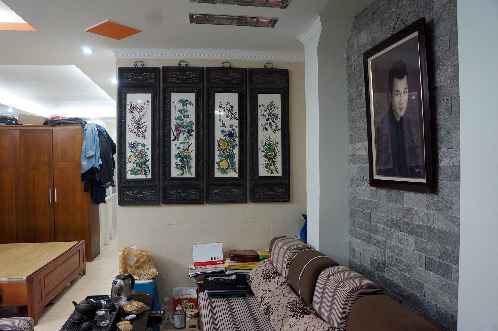 Cách bày trí của phòng khách khá đơn giản gồm bộ bàn ghế salon uống nước, trên tường treo ảnh nghệ thuật của nam ca sĩ Yêu lại từ đầu và bộ tranh tứ bình.