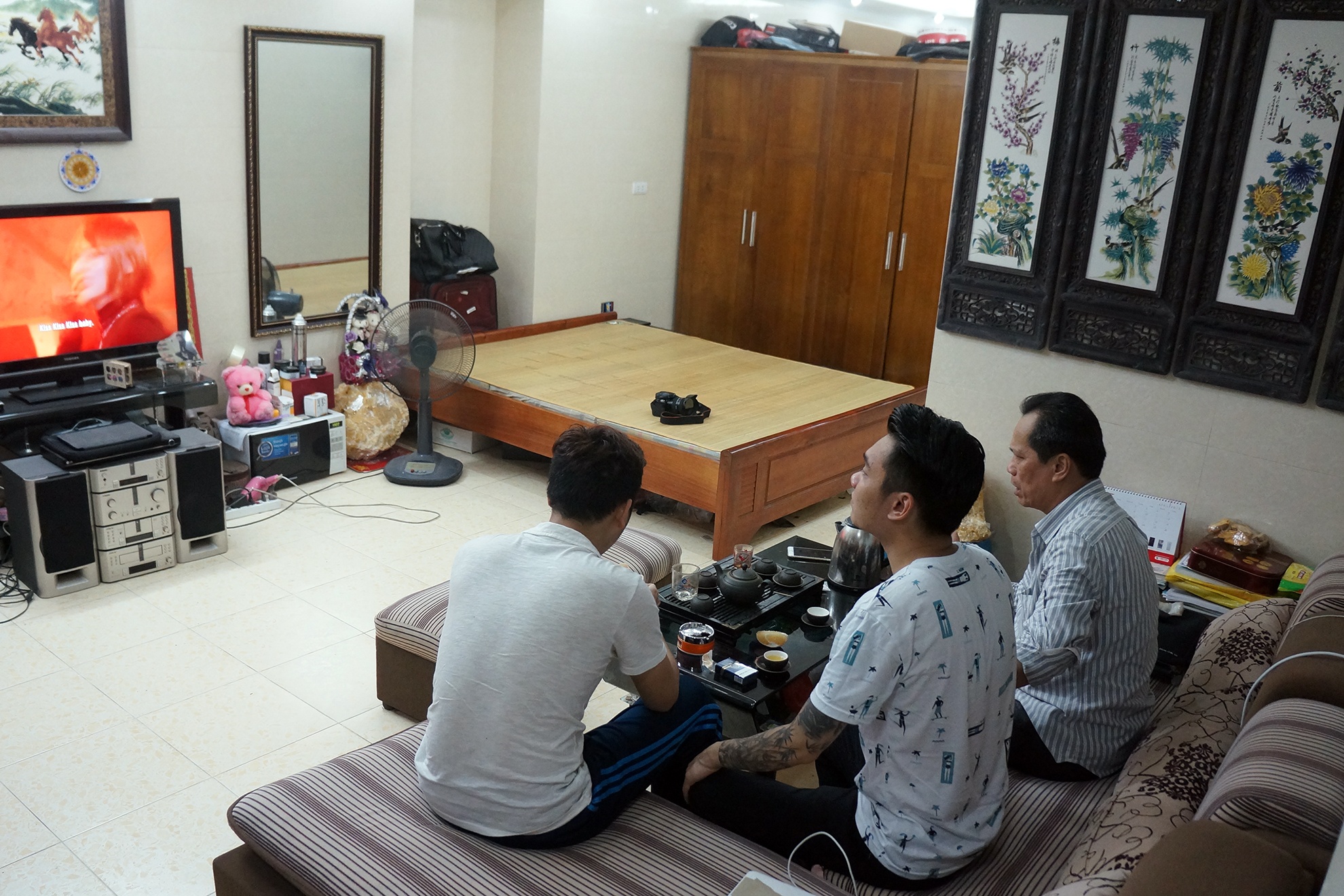 | Căn hộ rộng chừng 70m2. Trong đó, không gian phòng khách được tận dụng để kê thêm một tủ và giường - là nơi ngủ nghỉ của hai anh em Khắc Việt - Khắc Hưng. Những lúc rảnh rỗi, ba bố con anh thường ngồi uống nước, xem tivi và trò chuyện về những vấn đề thời sự hay xoay quanh các tiết mục giải trí được dàn dựng công phu. |