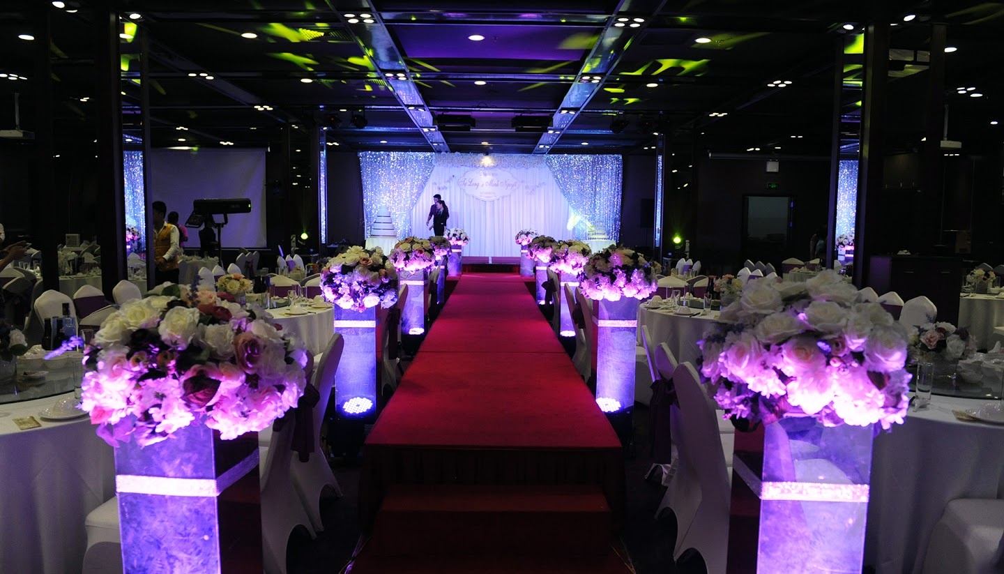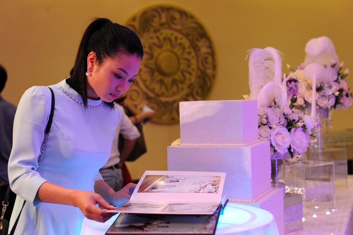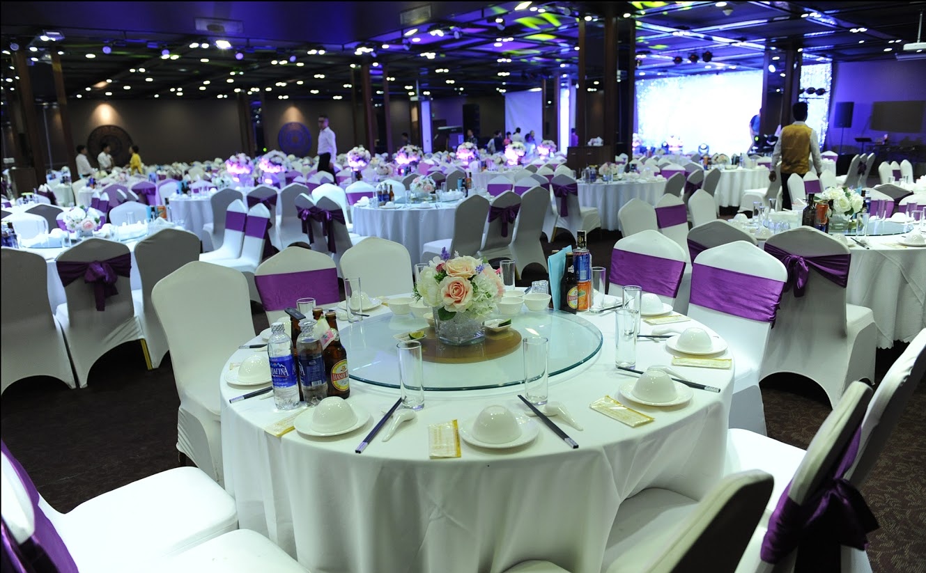| Không gian tiệc cưới của Tự Long được bày trí đơn giản với hai tông màu chủ đạo là tím và trắng - tượng trưng cho sự chung thủy của đôi uyên ương. |