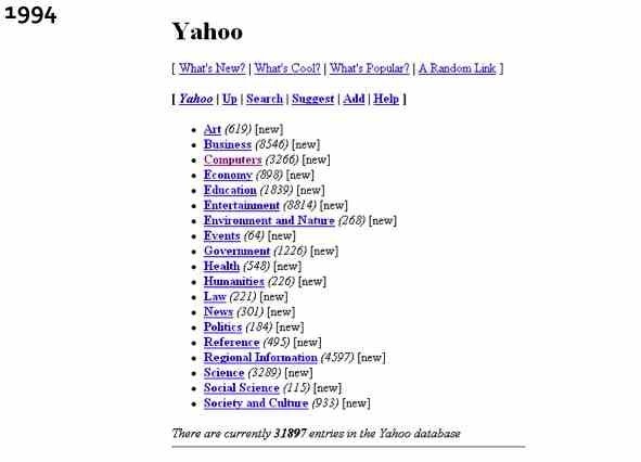 1994 là năm Yahoo ra đời. Đây là giao diện website của Yahoo thời điểm đó.