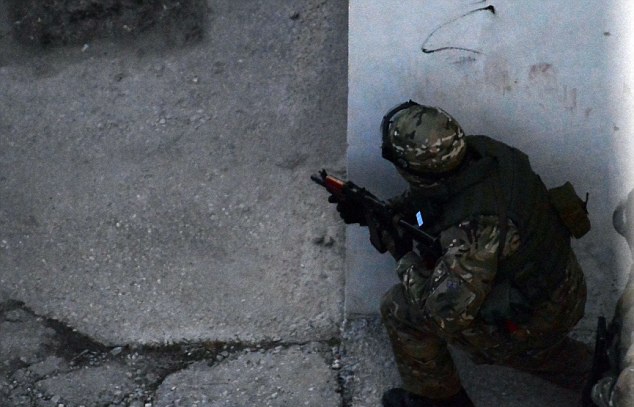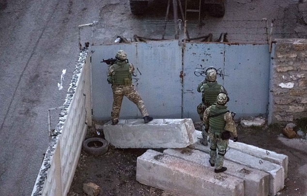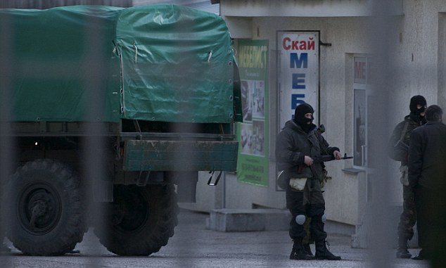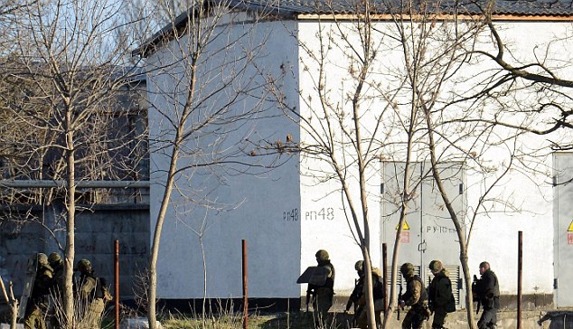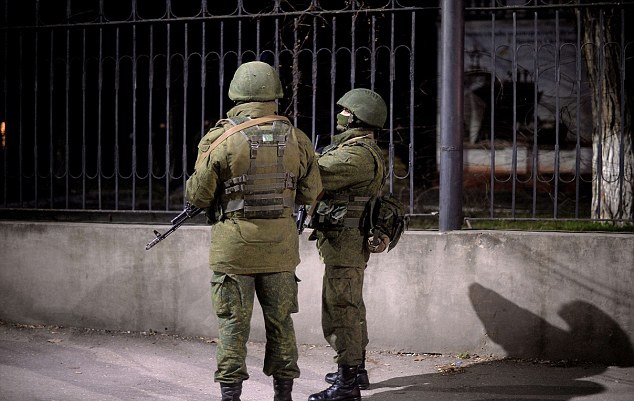 | Theo Daily Mail, binh sĩ Nga bắt các sĩ quan tại thủ phủ Simferopol của Crimea sau vụ nổ súng khiến hai người thiệt mạng. Trước đó, cùng ngày 18/3, Tổng thống Nga Vladimir Putin và đại diện Crimea ký kết hiệp ước sáp nhập bán đảo tự trị Crimea vào Liên bang Nga. Ảnh: AFP. |