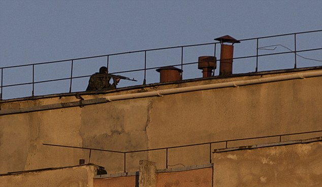 | Một tay súng gác trên mái của căn cứ quân sự Ukraina ở Crimea. Những kẻ có vũ trang đã nổ súng tại căn cứ quân sự khiến một binh sĩ Ukraina và một thành viên lực lượng tự vệ tử vong. Ảnh: AP. |
