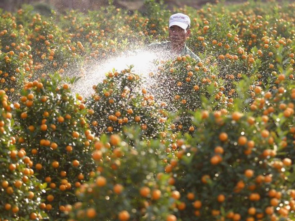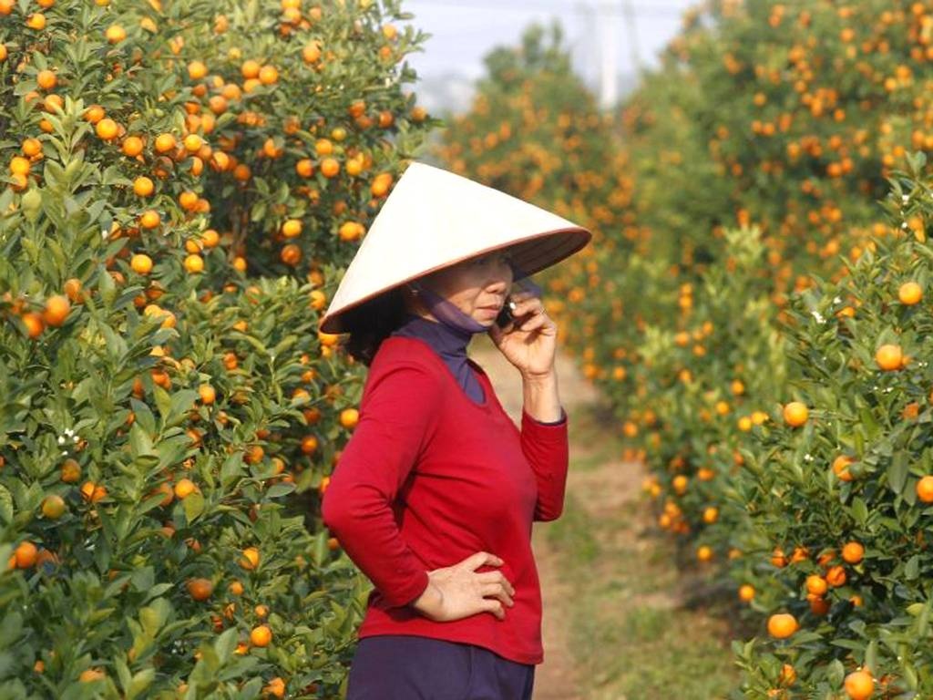 | Người phụ nữ nghe điện thoại trong lúc chờ khách mua quất. |