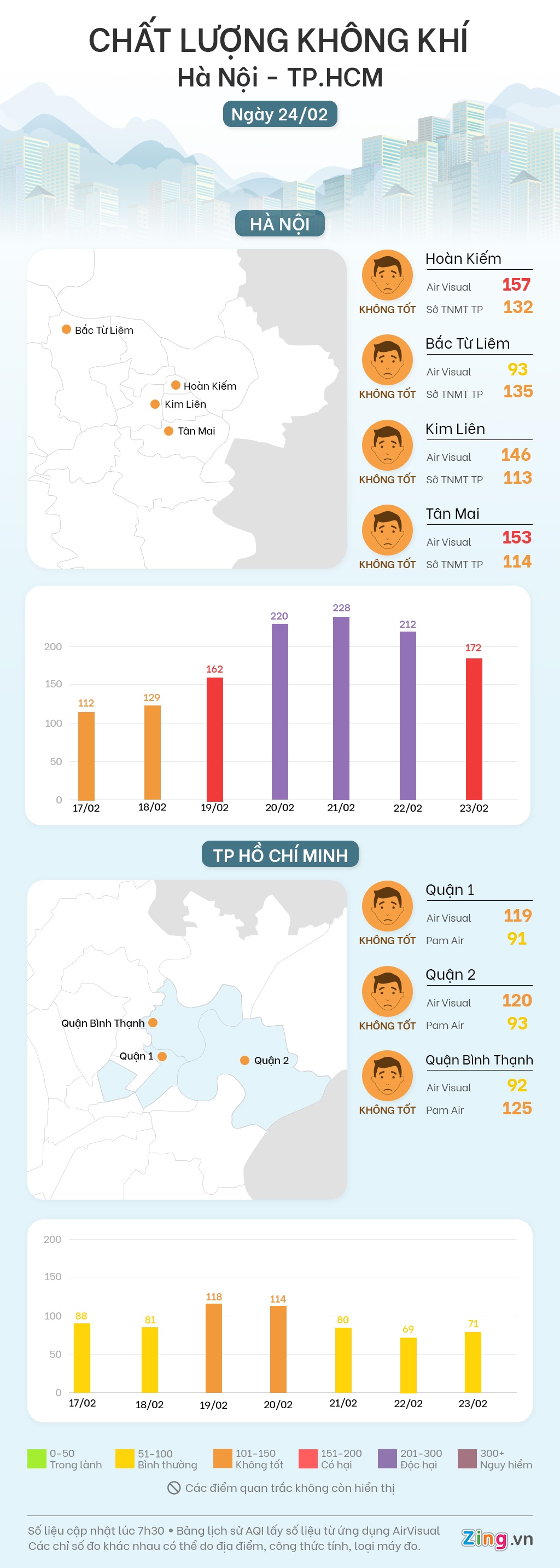 Sau 3 ngày không khí ở ngưỡng rất xấu, sáng 24/2, không khí Hà Nội được cải thiện. Còn không khí tại TP.HCM khá hơn, nhiều nơi AQI dưới 100.