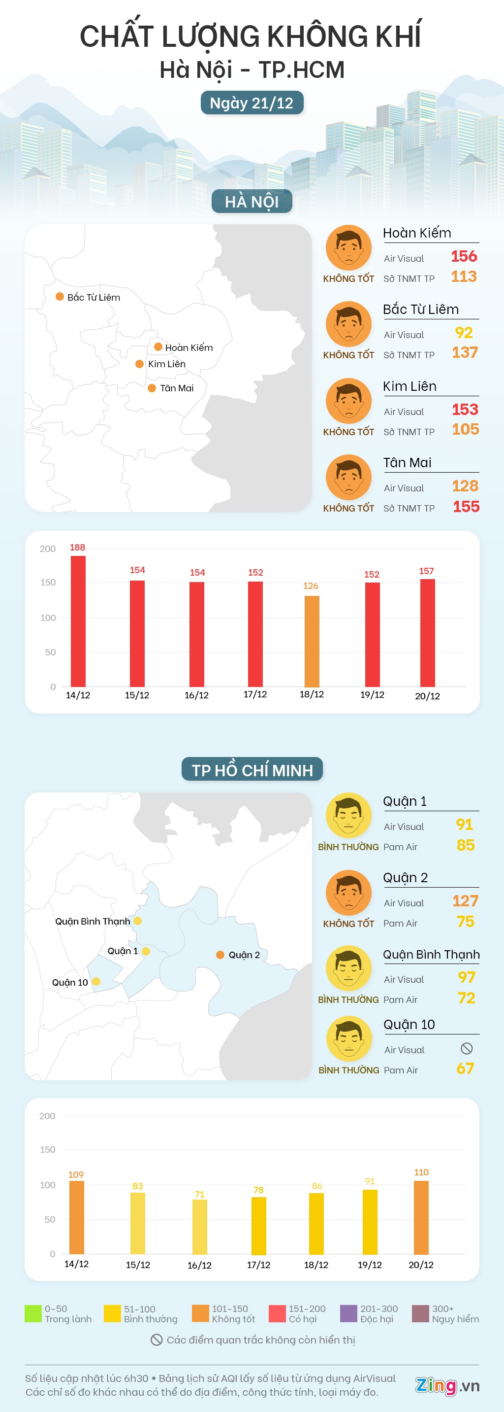 Chỉ số AQI tại các điểm quan trắc ở Hà Nội trong khoảng từ 50 đến 200, không khí ở ngưỡng trung bình. TP.HCM tương đối trong lành với hầu hết điểm quan trắc có chỉ số dưới 100.