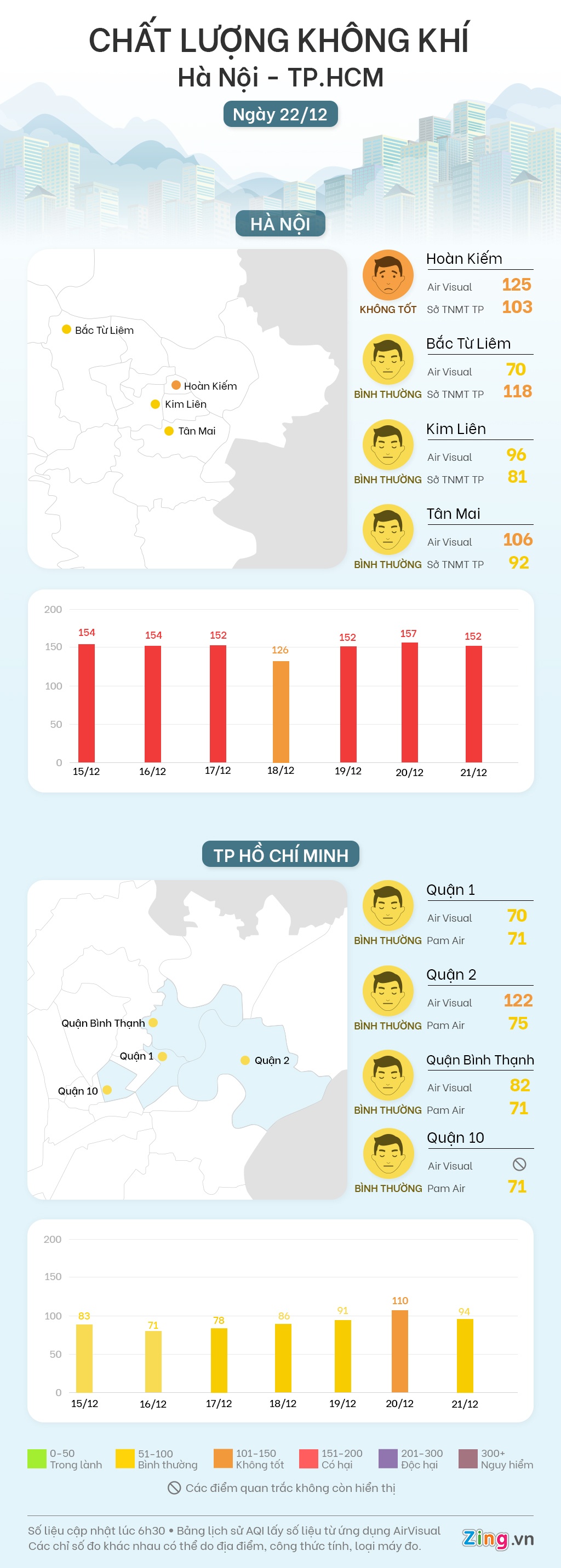 Sau nhiều ngày ô nhiễm vượt mức, không khí Hà Nội sáng 22/12 trở lại mức trung bình khi hầu hết chỉ số AQI dưới 150. Còn tại TP.HCM, không khí vẫn trong lành.