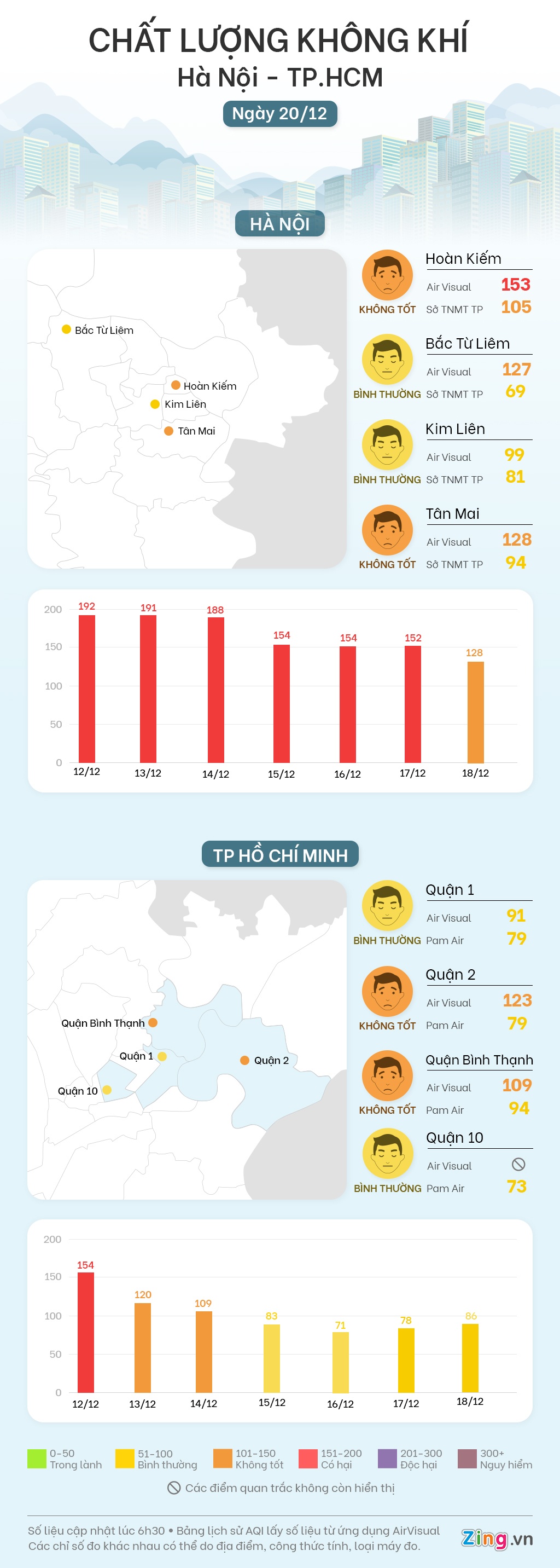 Chỉ số AQI tại Hà Nội và TP.HCM trong khoảng từ 50 đến 200 đơn vị, đa số là dưới 100. Chất lượng không khí ở ngưỡng trung bình, cải thiện so với nhiều ngày trước đó.
