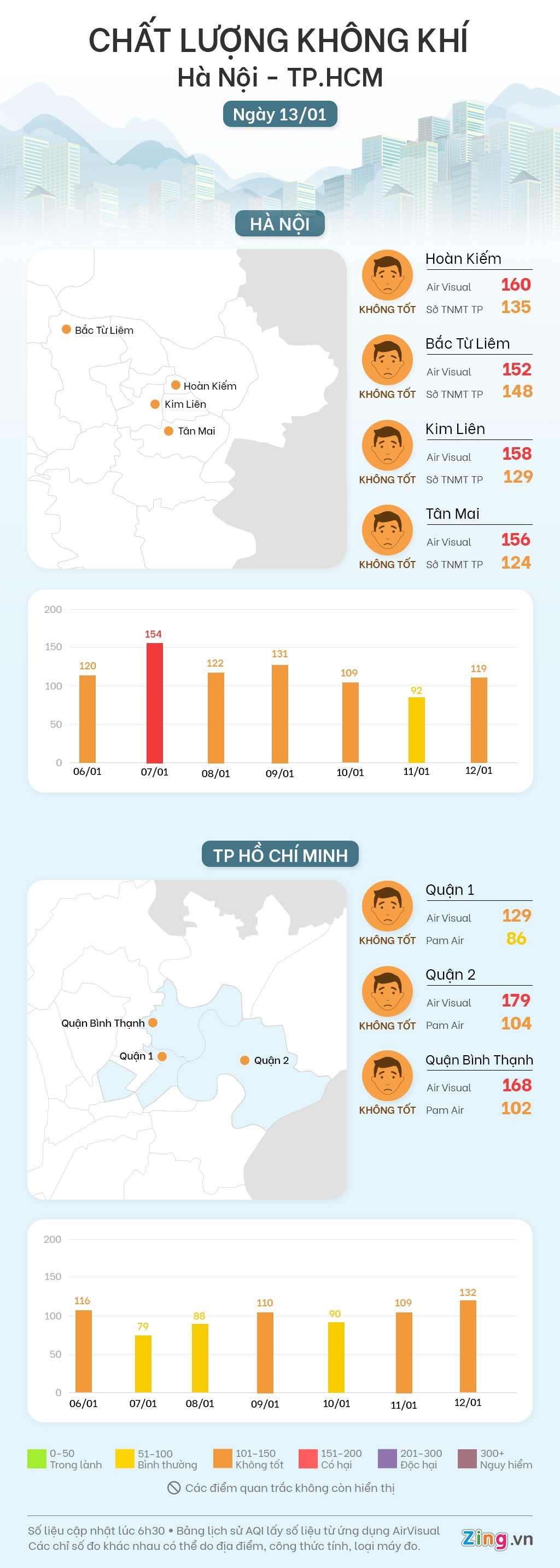 Không khí Hà Nội và TP.HCM ở ngưỡng không tốt ngày đầu tuần
