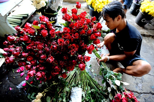 Người bán hoa bận rộn chuẩn bị hoa hồng để phục vụ các cặp đôi tới mua tại khu chợ truyền thống ở