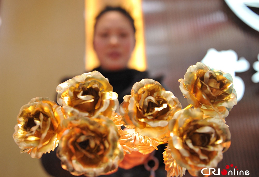 Một cửa hàng ở tỉnh Chiết Giang, Trung Quốc, bày bán những bông hồng bằng vàng ròng 24 caras, nhân ngày 14/2. Nhiều khách hàng tỏ ra thích thú với bông hồng tình yêu đặc biệt này. Ảnh: CRI