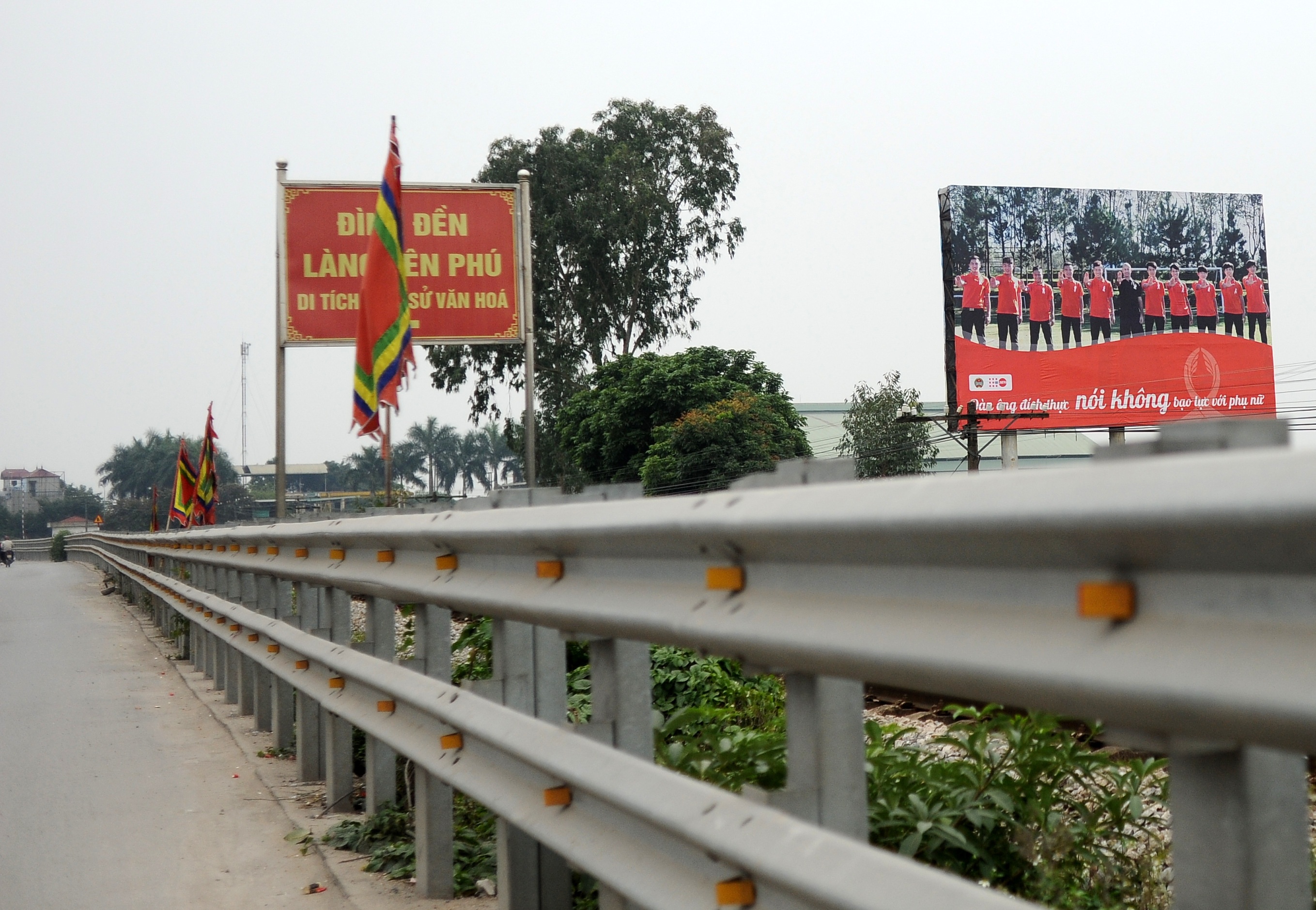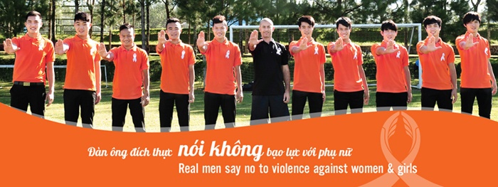 | Hình ảnh Công Phượng và đồng đội xuất hiện dọc bên đường quốc lộ với khẩu hiệu "Đàn ông đích thực nói không bạo lực với phụ nữ". |