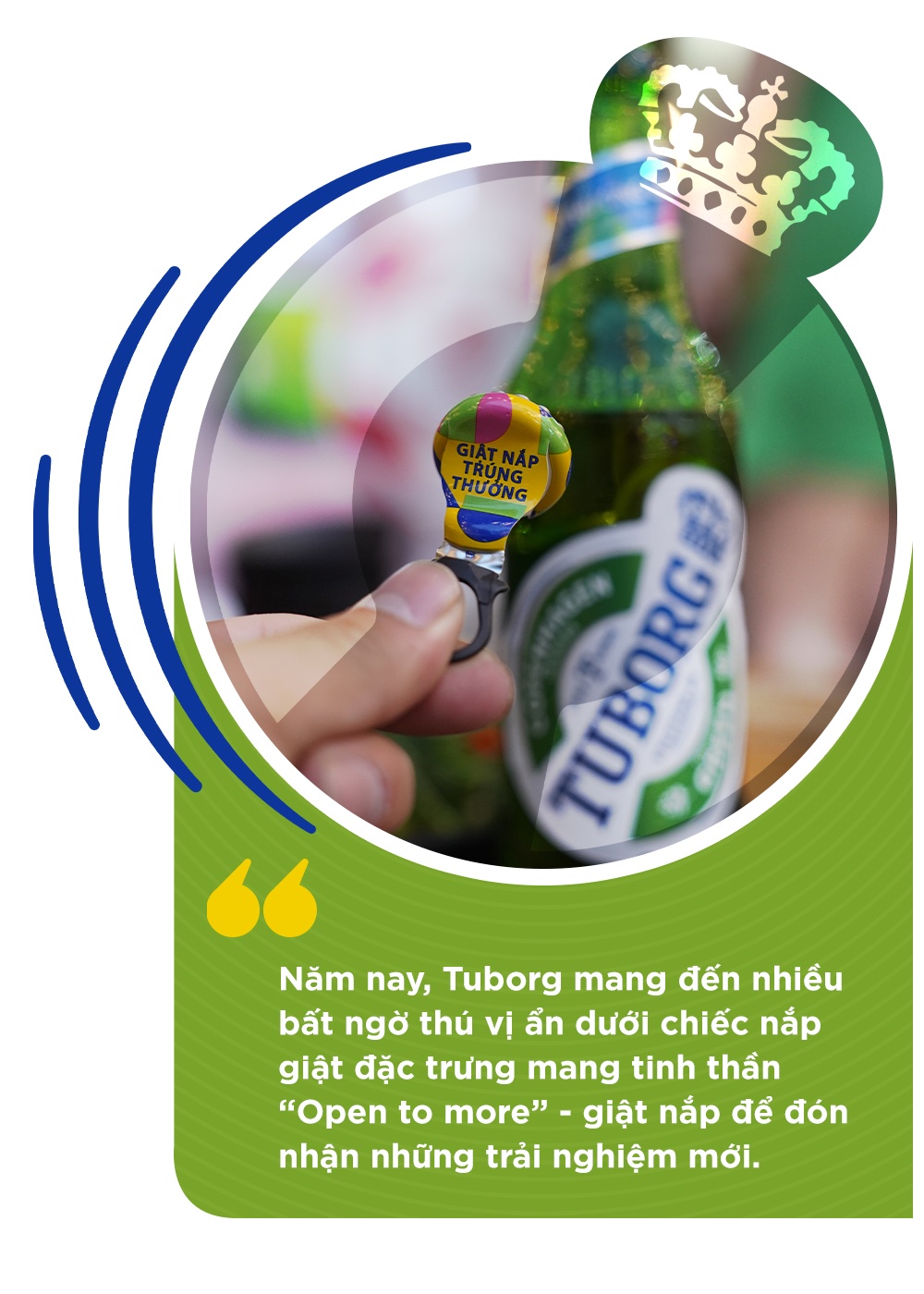 Với chiếc nắp giật độc đáo cùng thông điệp “Open to more”, Tuborg đã đồng hành cùng người trẻ khám phá thế giới, đánh thức giới hạn mới, sẵn sàng bứt phá khỏi lối mòn quen thuộc để rộng lòng đón nhận cuộc sống nhiều bất ngờ thú vị. Tinh thần ấy được Tuborg hiện thực hoá bằng muôn vàn cách khác nhau, nhưng tất cả đều truyền đi năng lượng tích cực của tuổi trẻ về sự dấn thân, dám sống khác biệt để được là chính mình.