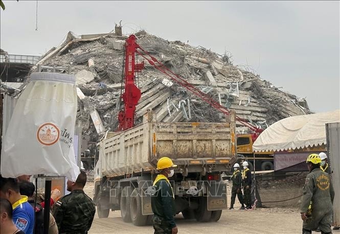 Lực lượng cứu hộ làm nhiệm vụ tại toà nhà bị sập ở thủ đô Bangkok, Thái Lan do ảnh hưởng từ trận động đất ở Myanmar, ngày 29/3/2025. Ảnh: Kyodo/TTXVN. |