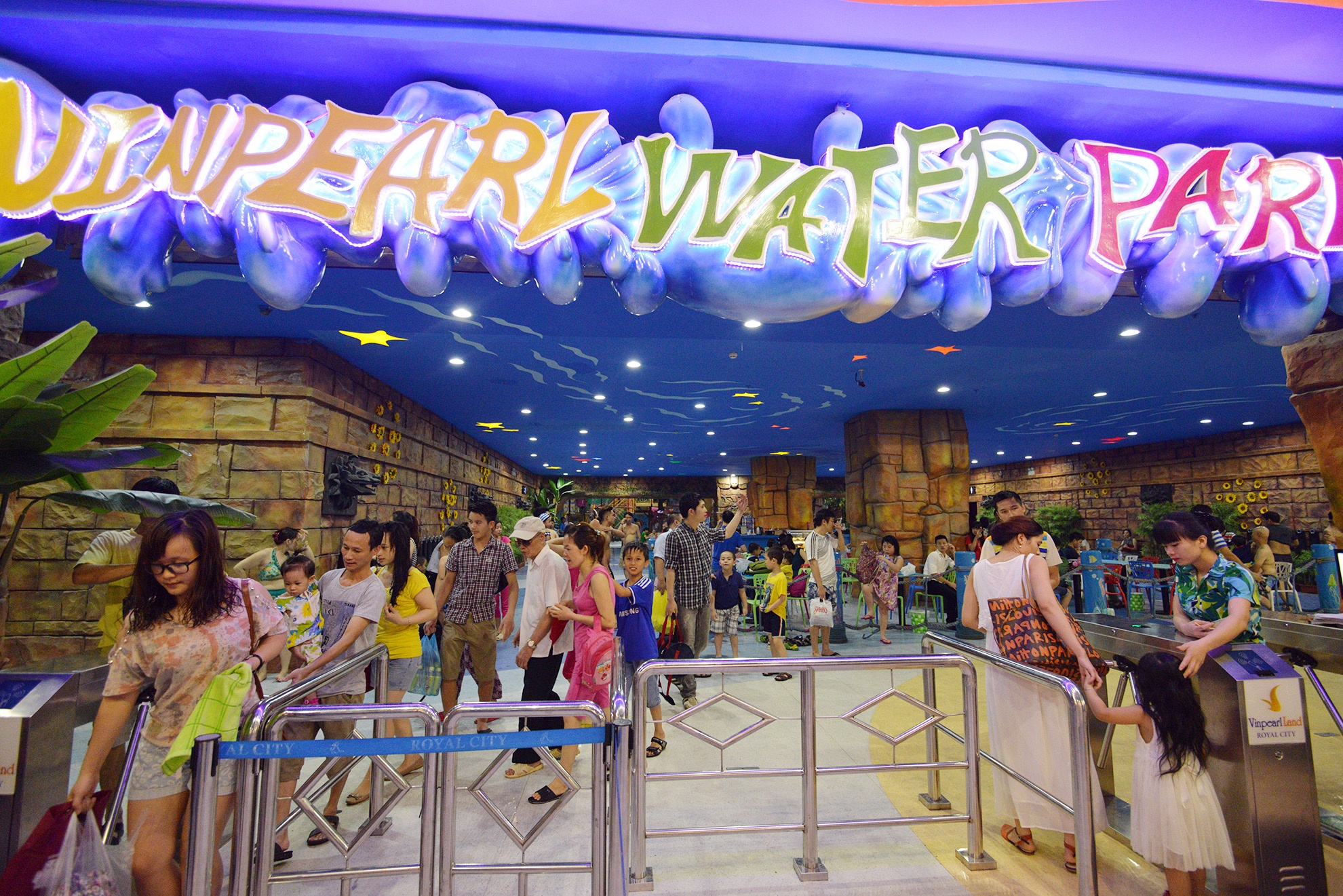 | Có khá đông người, đặc biệt là trẻ em đổ về công viên dưới lòng đất Royal City. Giá vé 2 ngày cuối tuần từ 150.000-220.000 đồng/người. |