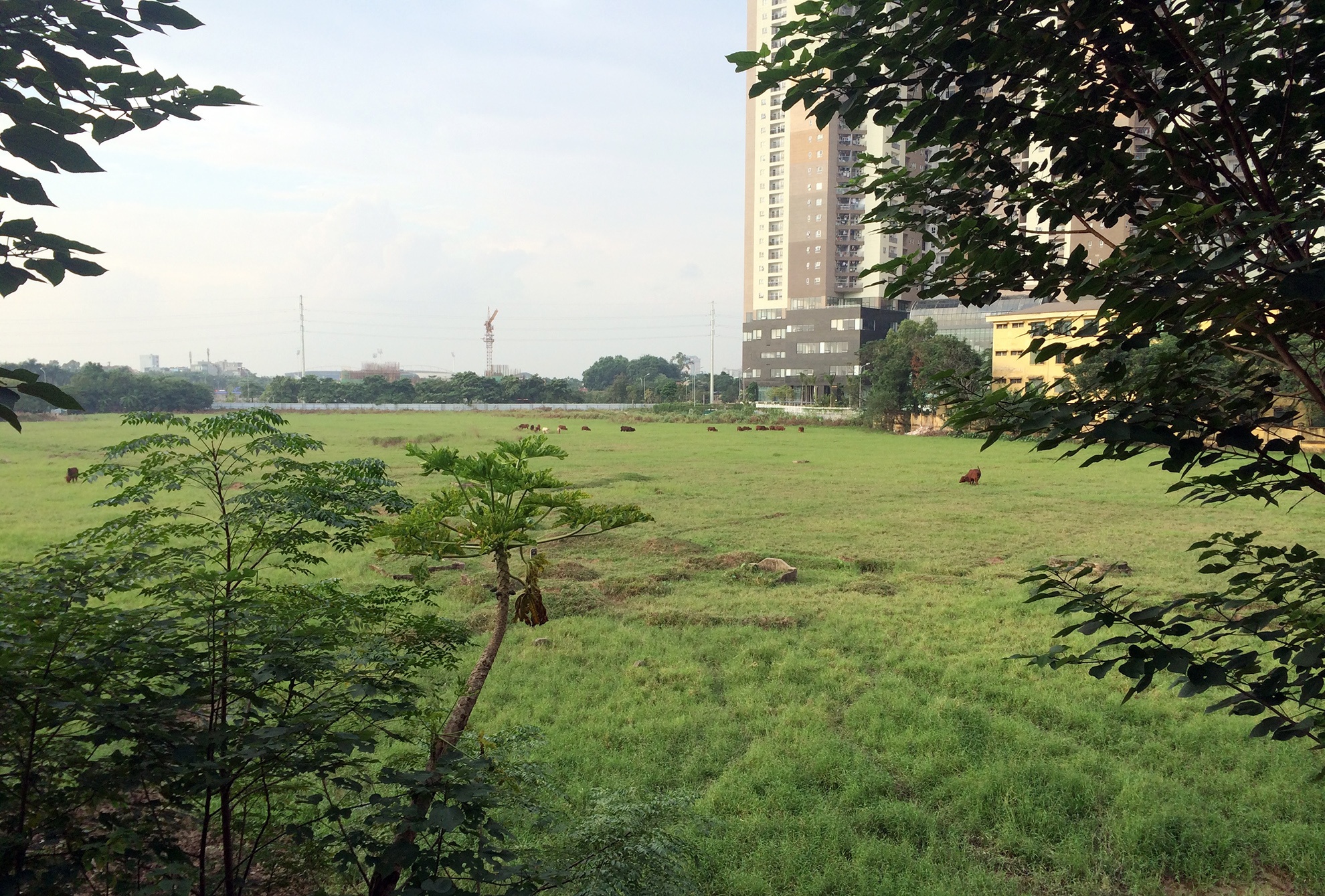 Từ trên đồi đất do một số hộ dân trong làng tự tạo để dựng trại nuôi gia súc nhìn xuống, khu đất dự án không khác gì cánh đồng bỏ hoang được dùng làm bãi chăn thả trâu, bò, ngựa và cả lợn mán. |