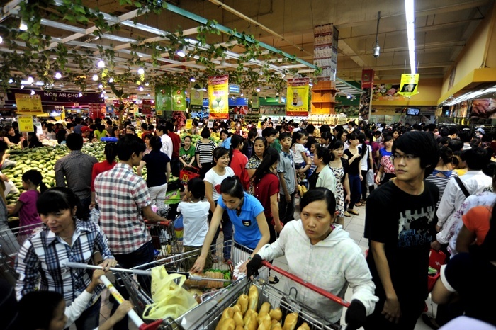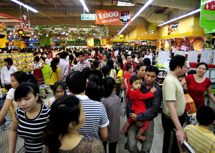 | Đối lập với cảnh vắng vẻ ở các trung tâm thương mại lớn, tại siêu thị bình dân, khách vẫn chen chúc, tranh nhau mua hàng. |