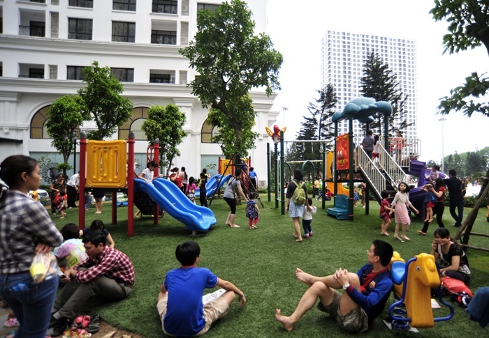 | Không có nhiều gia đình đưa con đi chơi tại các trung tâm thương mại, trong dịp 30/4 năm nay. Chị Trần Thu Hiền, nhà ở phố Vũ Trọng Phụng (Q. Thanh Xuân, Hà Nội) chia sẻ, vì lo dịch sởi, nên chị chỉ dám cho bọn trẻ chạy nhảy ngoài sân trung tâm thương mại cho đỡ "buồn chân", trước khi về quê ngoại ở Việt Trì (Phú Thọ) vào ngày 1/5. |