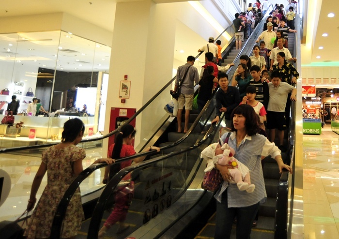| Khu cầu thang lên xuống vắng hơn ngày thường. Một nhân viên bán hàng tại trung tâm thương mại này cho biết, cả buổi sáng chỉ ngồi nhìn nhau vì không có khách. "Năm nay không kỳ vọng gì bán được hàng trong dịp nghỉ lễ này. Sức mua cực chậm", chị Nguyễn Thị Thanh Thảo, nhân viên một quầy hàng dưới tầng một cho biết. |