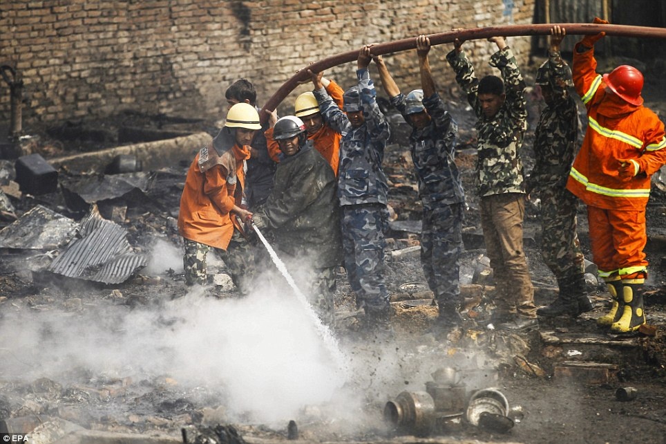 | 5 lính cứu hỏa, hai xe chữa cháy, cảnh sát và lực lượng quân đội của Nepal tới hiện trường lúc 1h chiều hôm 9/3. Ảnh: EPA. |