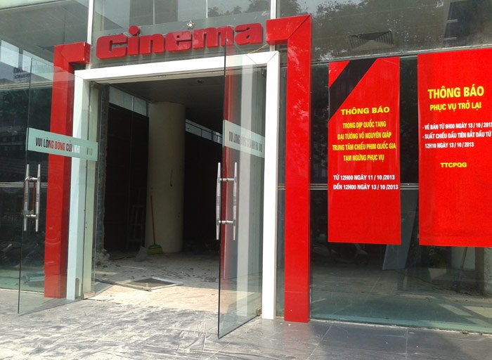 | Biển thông báo trước cửa trung tâm chiếu phim quốc gia. |