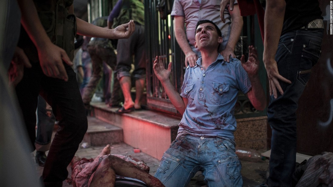 | Một chàng trai đau khổ khi chứng kiến cái chết của người thân tại một bệnh viện dã chiến ở thành phố Aleppo. Ảnh: Getty |