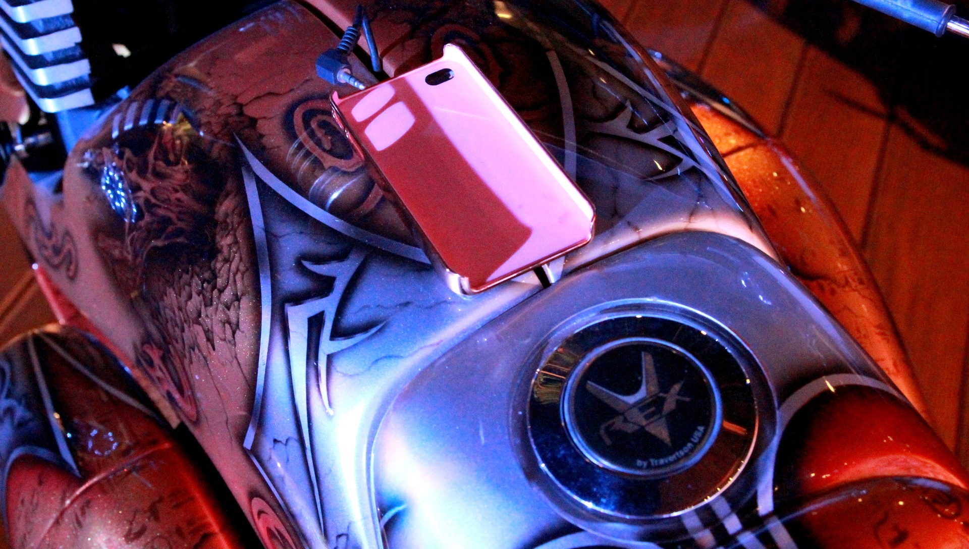 | Sạc iPhone được đặt trên nắp bình xăng. |
