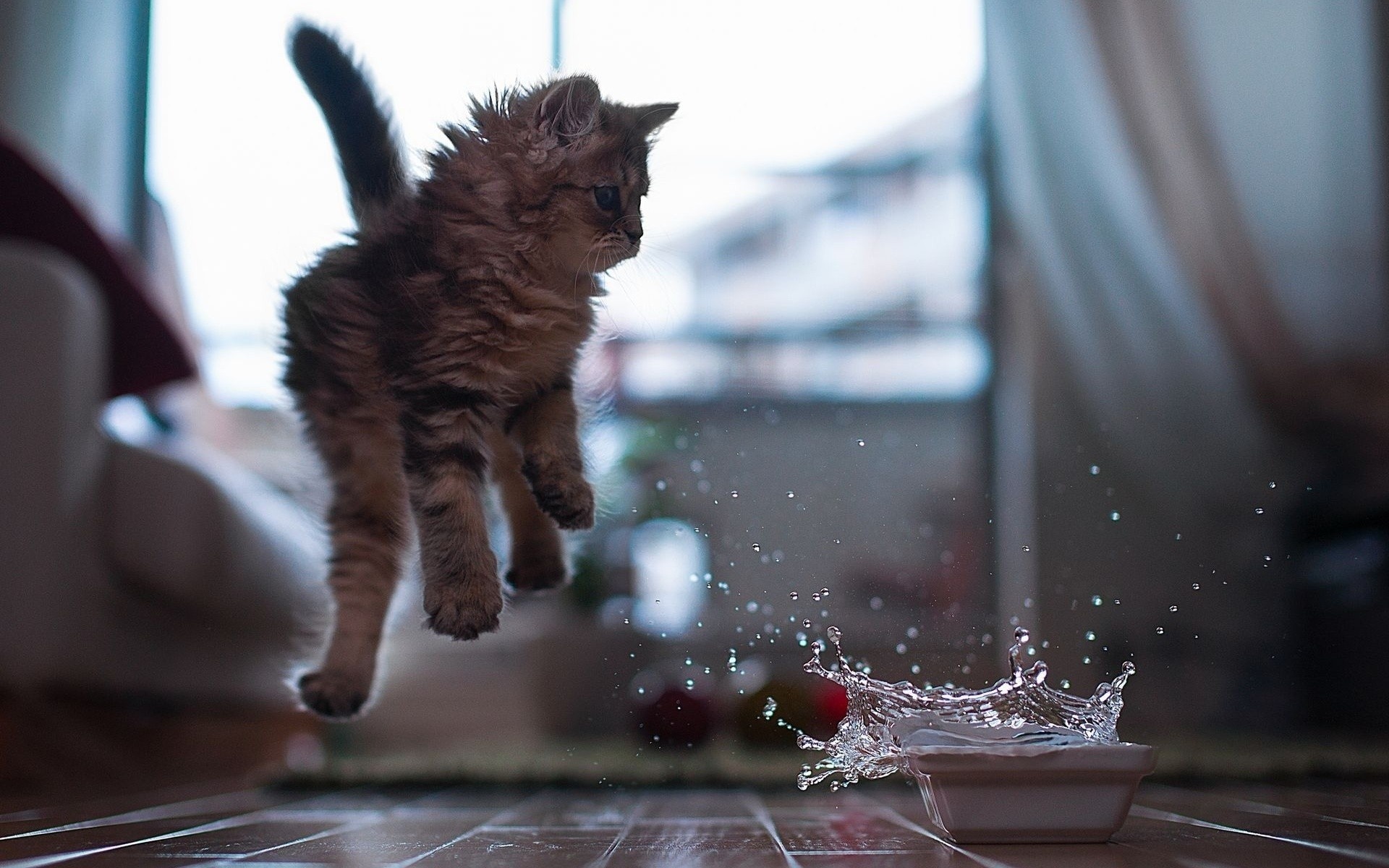 | Mèo con nhảy lên không trung khi một vật thể lạ rơi vào bát nước. Ảnh:blog.asiantown.net |
