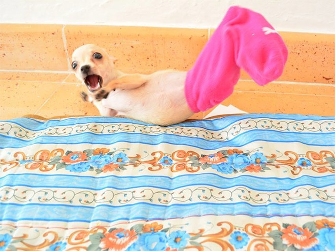 | Chó giật mình và ngã xuống đất khi nó nghịch tất hồng của chủ nhân. Ảnh:blog.asiantown.net |