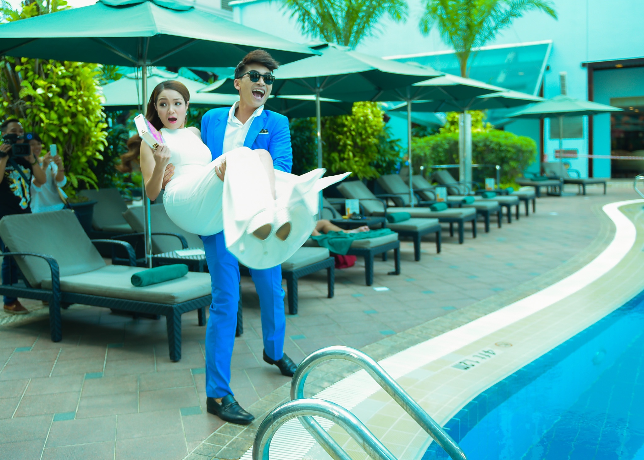 | Khương Ngọc bế bổng Thủy Top trước khi buổi họp báo bắt đầu. Cô không ngại bạn gái Khương Ngọc ghen vì rất thân thiết với Khả Như. |