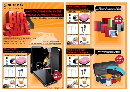 Tại trung tâm 144 Võ Thị Sáu, Q.3, Mai Nguyên sẽ liên kết cùng với nhiều hãng tổ chức các chương trình khuyến mãi hấp dẫn, trong đó nổi trội là chương trình “Mua một tặng một” dành riêng cho các phụ kiện chính hãng do TechCity phân phối. Theo đó, từ 6/8 đến hết 6/9, khách hàng sẽ có cơ hội nhận ngay quà tặng hấp dẫn khi mua các sản phẩm pin dự phòng Mili Power như Spring 4 (chuyên cho iPhone4/4S), Spring 5 (chuyên cho iPhone5), Crystal II-III-IV (phiên bản pin mới nhất, dung lượng cao)…, các sản phẩm loa Divoom kết nối Bluetooth như Solo, Bluetune-1, Onbeat-200…, các sản phẩm bao da thời trang cho iPad thuộc các thương hiệu nổi tiếng như Puro, Verus, UniQ, Ferrari, Lamborghini, Just Cavalli…