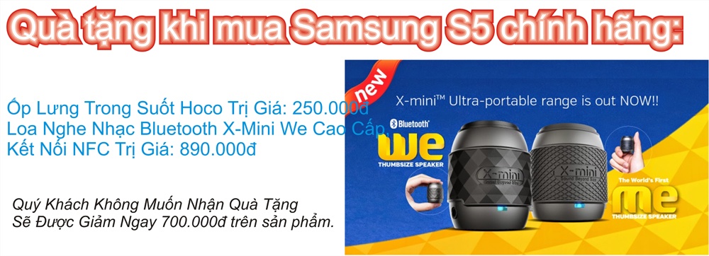 Khách mua điện thoại Samsung Galaxy S5 chính hãng sẽ được tặng một ốp lưng Hoco trong suốt, trị giá 250.000 đồng, một loa nghe nhạc bluetooth X-Mini We cao cấp trị giá 890.000 đồng.