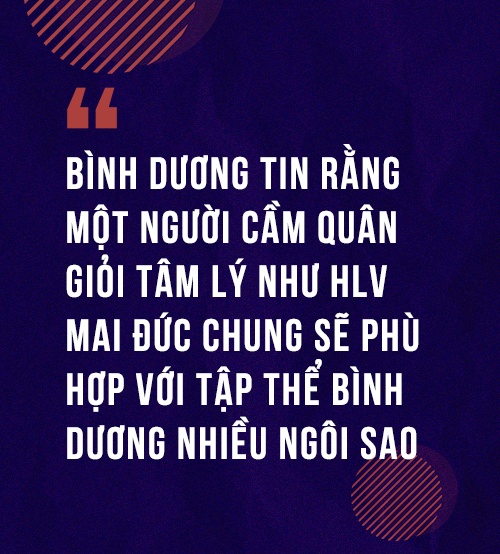 Bối cảnh ấy khiến trưởng đoàn CLB Bình Dương Trần Văn Đường phải bay ra Hà Nội, tìm gặp HLV Mai Đức Chung, người khi ấy vừa nghỉ hưu. Bình Dương tin một người cầm quân giỏi tâm lý, biết cách xoa dịu những cá tính mạnh sẽ là nhân vật phù hợp với đội bóng có nhiều ngôi sao như Bình Dương.