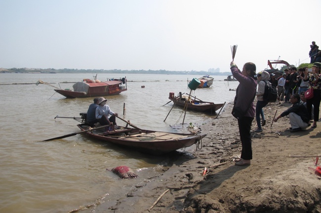 | Gia đình làm lễ chiêu hồn chị Huyền dưới chân cầu Thanh Trì. |