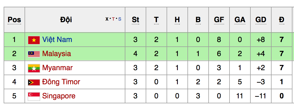 | Thứ tự xếp hạng tại bảng B trước lượt đấu cuối cùng. U19 Việt Nam vượt trội về cách chỉ số phụ. |