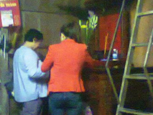 | Thầy lang băm Tư Ven (người phụ nữ đứng cạnh bàn thờ) đang “hành nghề” xem bói. |