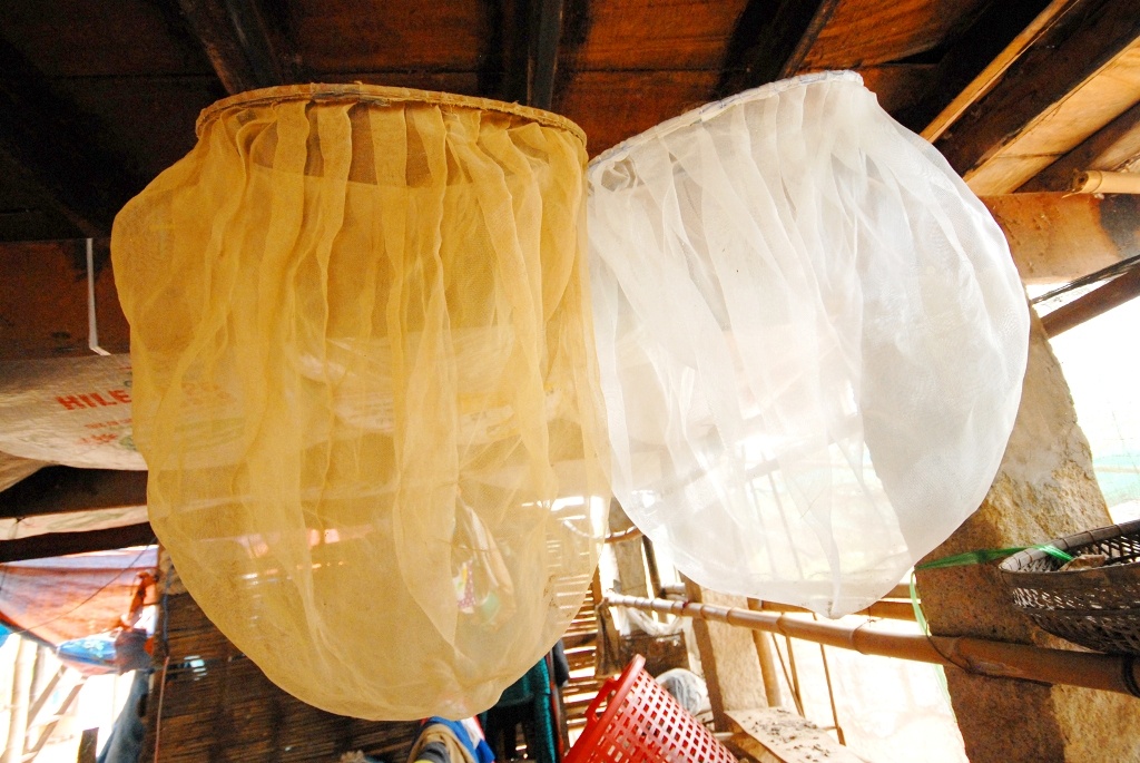Vợt xúc trùn được làm bằng lưới cước nhuyễn, có cán sắt.
