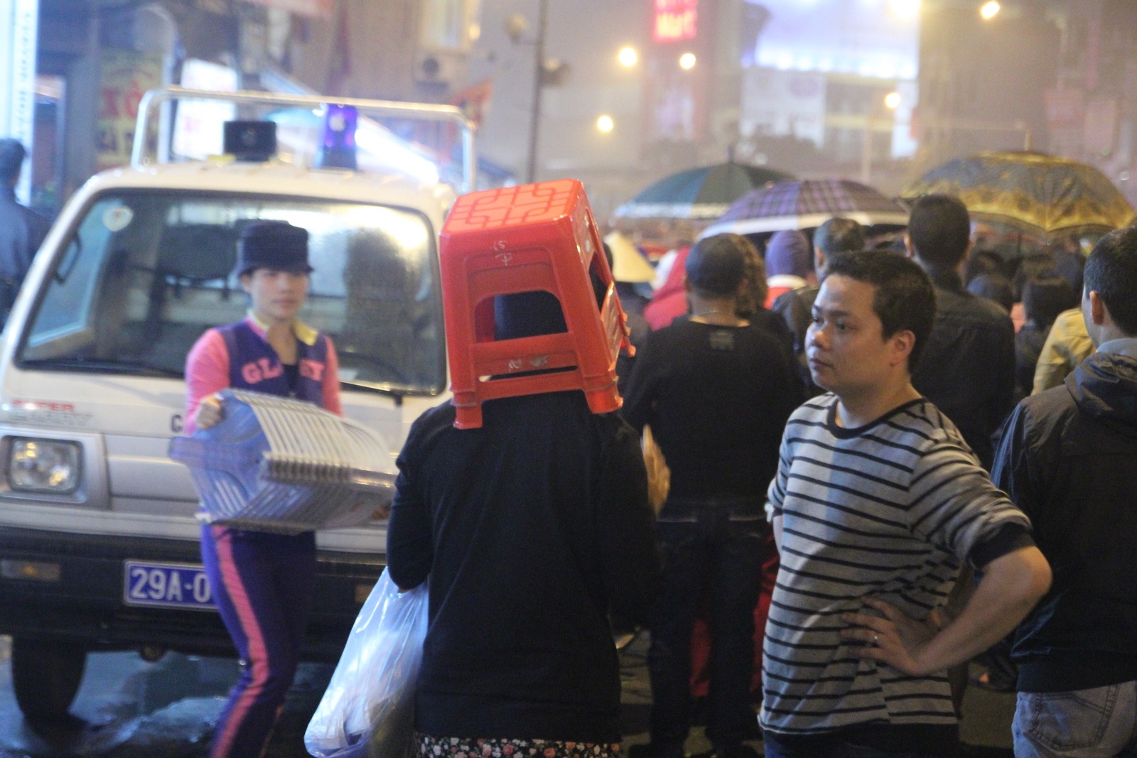 Mặc dù 19h mới diễn ra canh lễ nhưng sợ không còn chỗ ngồi nên bà Trần Thị Hồng (Đống Đa, Hà Nội) đến chùa Phúc Khánh từ 16h. Bà cho biết, do tuổi cao sức yếu, không thể đứng lâu được nên bà phải thuê ghế ngồi với giá 25.000 đồng/chiếc. Tuy nhiên, trước khi cho thuê, chủ hàng còn giao kèo, nếu người thuê làm gãy ghế hoặc nhầm lẫn phải đền nửa giá trị của nó.