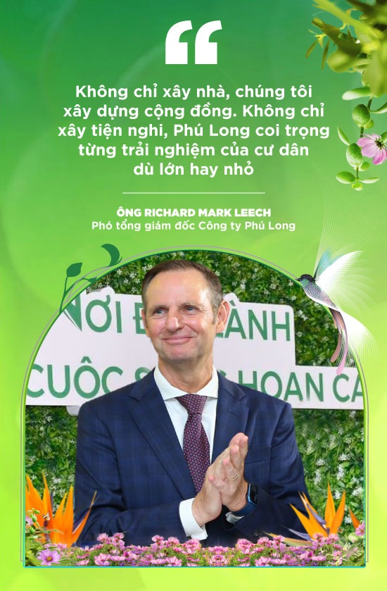 Ông Richard Mark Leech - Phó tổng giám đốc Phú Long - chia sẻ: “Tại Phú Long, chúng tôi hướng đến những mục tiêu lớn hơn. Không chỉ xây nhà, chúng tôi xây dựng cộng đồng. Không chỉ xây tiện nghi, chúng tôi coi trọng từng trải nghiệm của cư dân dù lớn hay nhỏ. Từ không gian sống đậm chất văn hóa đến những thành phố mở cho mọi kết nối quốc tế, Phú Long bền bỉ nuôi dưỡng cuộc sống bền vững, kiến tạo thương mại và tôn vinh văn hóa cho cư dân”.