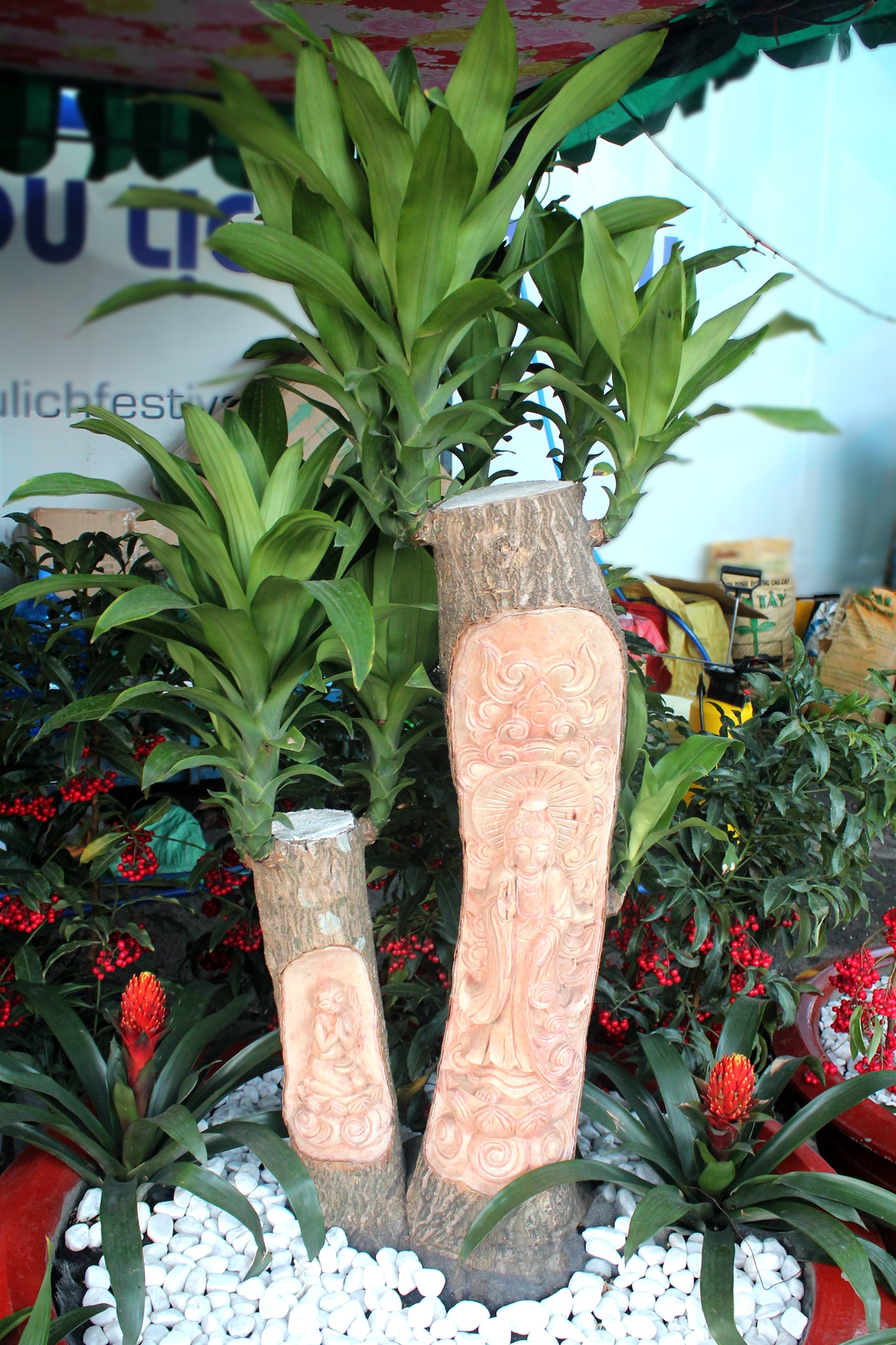 | Sản phẩm mới nhất chợ hoa năm nay là cây phát tài hình tượng phật. Một nghệ nhân đến từ huyện Hóc Môn, TP HCM đã nghiên cứu thành công công nghệ khắc tượng lên cây kiểng phát tài.