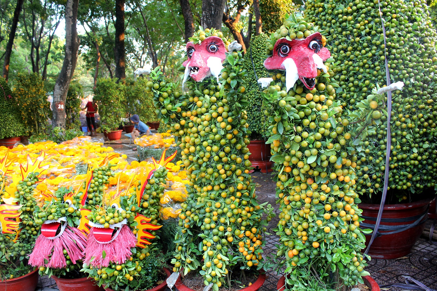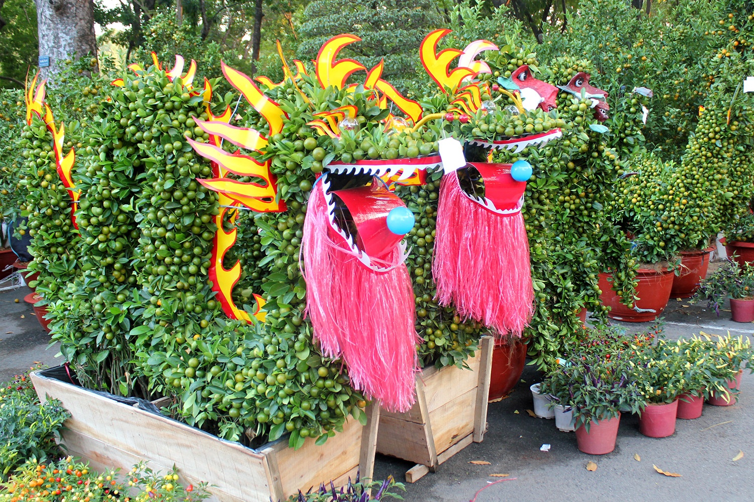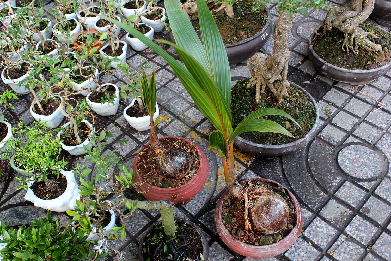Nhiều loại kiểng lạ như cây phát tài khắc hình Phật, tắc rồng khỉ, dừa khô... cùng nhiều loại kiểng nông sản lạ mắt đang đổ bộ về các chợ hoa ở TP HCM.